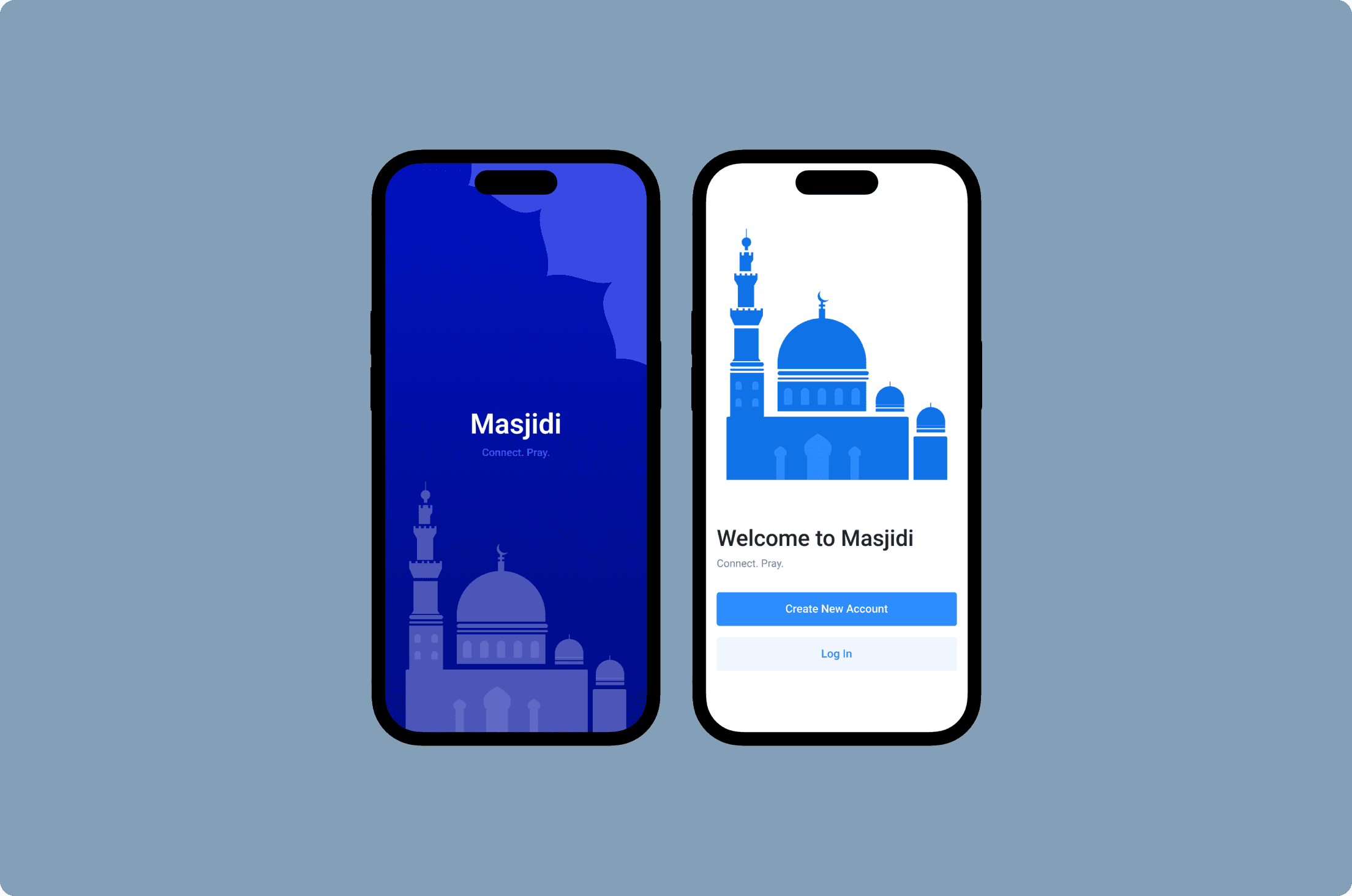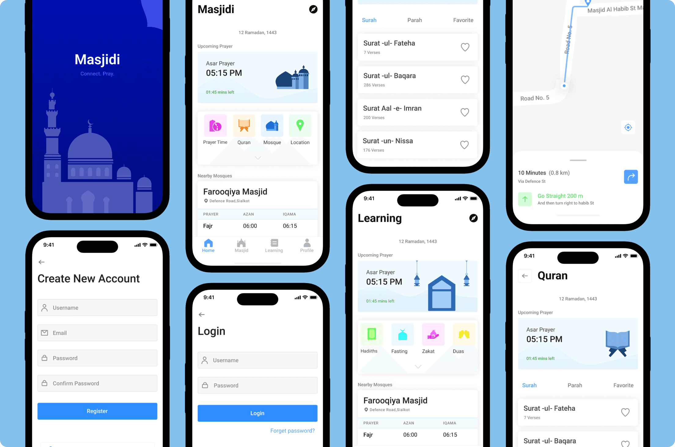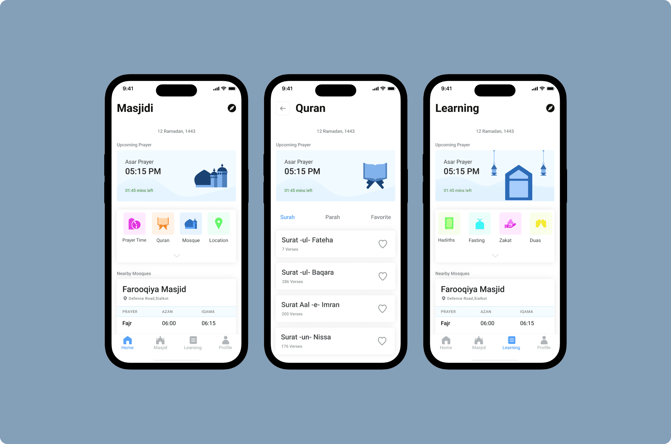Consistent Visual Language: The design follows a blue color scheme, representing spirituality and peace, with clean typography and mosque illustrations to maintain a culturally relevant aesthetic.