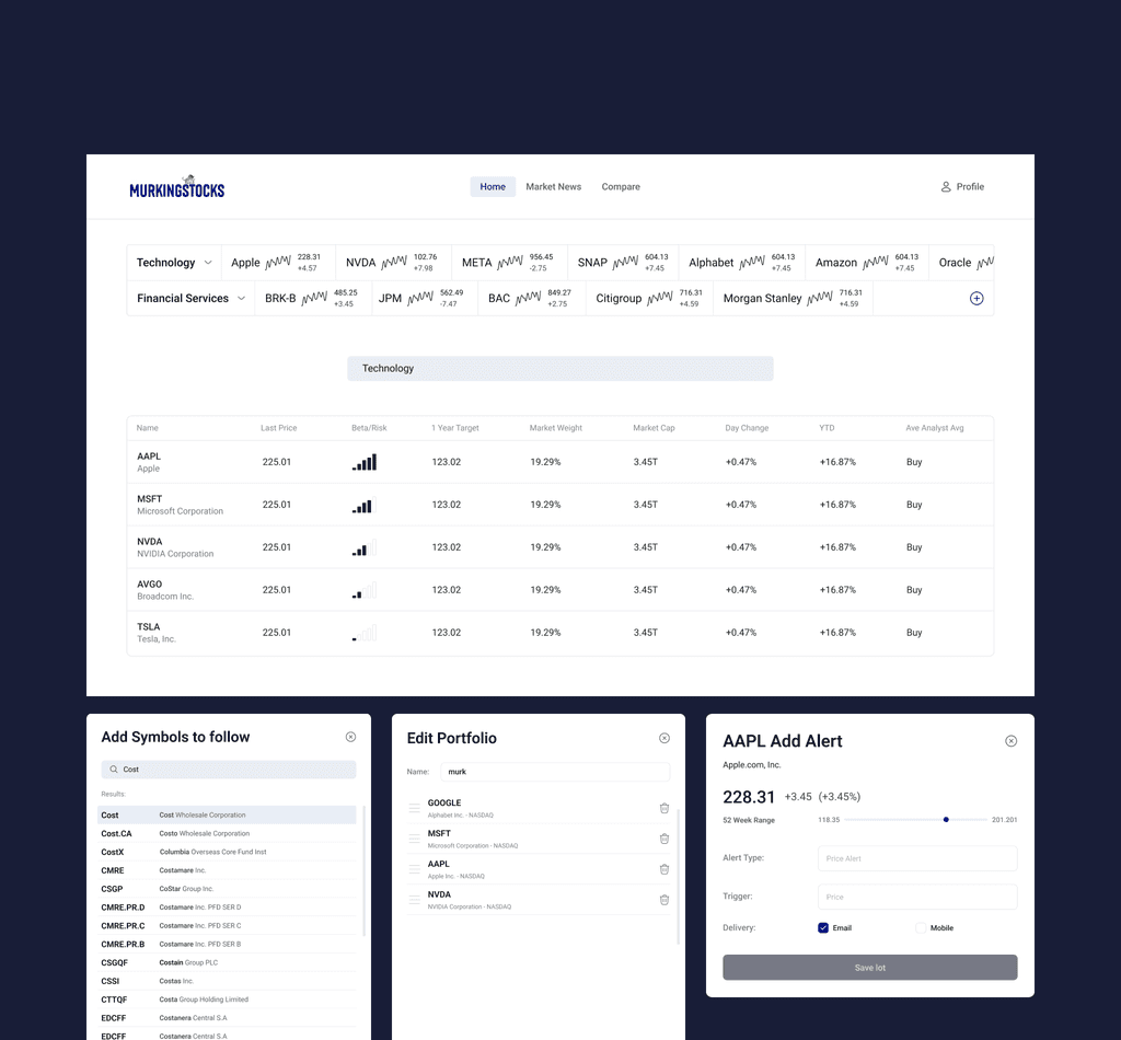 I designed a real-time dashboard with clear visual hierarchy, ensuring users could quickly interpret changes in stock values.