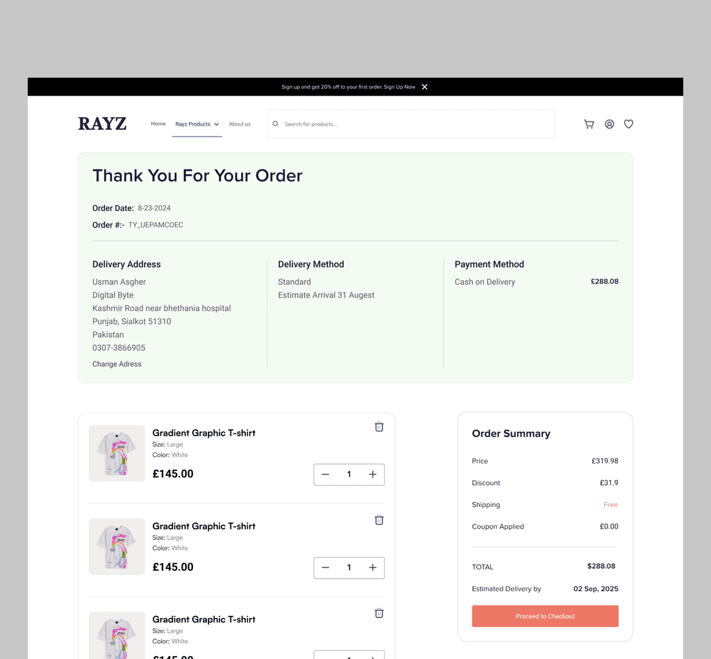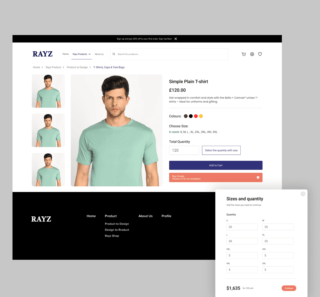 Rayz is a custom e-commerce platform that allows users to personalize products with their favorite designs. From caps and shirts to hoodies and more, customers can choose a product, add a print design, and have it shipped directly to their doorstep—creating a seamless print-on-demand shopping experience.