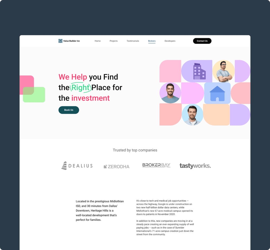 I created a brand-new visual language, carefully selecting colors, typography, and icons to reinforce the real estate and investment theme.